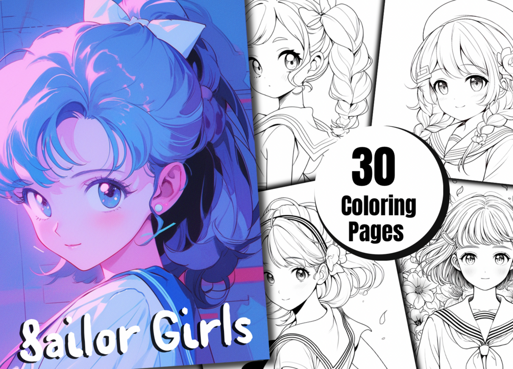 1 PDF file with 30 coloring pages of sailor anime girls (8.5"x11" page size)